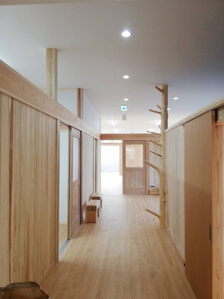 ★ 玄関左は事務所です。車椅子対応です。変木を使って木登りみたいに遊べます。椅子は全部で3つ作りました。裏にシートを貼っているので移動も簡単です