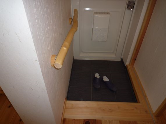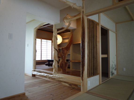 ★上がりがまち 変木の特徴を活かしかまちです。おもわず触ってしまいます。もちろん表面からは釘は見えません。団地の中の改装 .檜風呂で和室・かまち・欄間 総工費500万円(4DK)