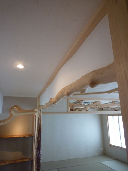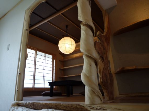 つるまき柱と言っています。でもこのような材木は珍しいのです。料亭や高級旅館にはいいかも知れません。茶室4畳半。 珪藻土の壁